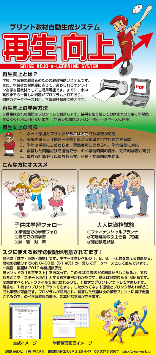 eラーニング 再生・向上スタート 2013年5月5日 / wark_staff Tweet 2010-01-17の記事です。 再生・向上スタート、プリント学習教材の自動生成システムです。 Tweet 未分類 eラーニング Previous post WARKサイトをマイナーチェンジしました。 Next post eラーニングの最新動向 無料セミナー開催のご案内